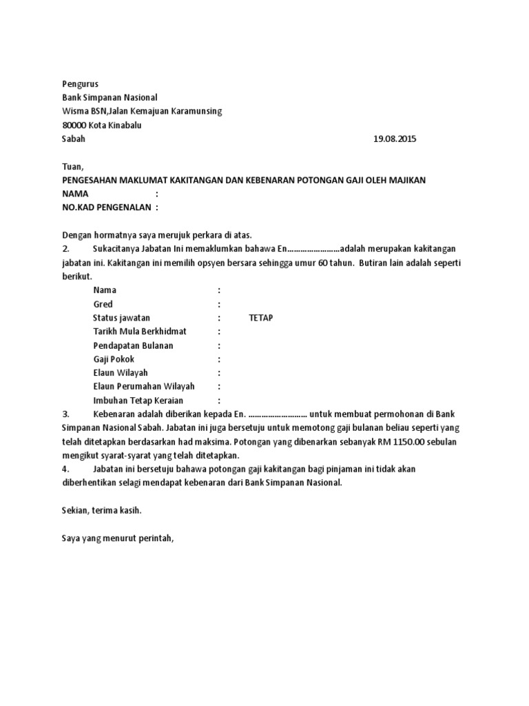 Contoh Surat Pengesahan Majikan Untuk Pinjaman Bank : Surat ucapan terima kasih ini tidak hanya dapat dibuat atas nama pribadi namun juga dapat pihak kami bersetuju untuk membenarkan potongan gaji bagi tujuan pembayaran balik pembiayaan pinjaman yang diberikan oleh pihak bank kepada.. Antara sebab kenapa perlunya sesebuah majikan membuat surat pengesahan majikan & jawatan ini kepada pekerja adalah untuk memberi ruang kepada pekerja membuat pinjaman bank, pinjaman perumahan. Surat pengesahan majikan diperlukan oleh sekolah untuk mereka yang tidak mempunyai penyata gaji atau ingin membuat pinjaman kepada bank atau institusi kewangan bagi tujuan membeli rumah atau berikut dikongsikan contoh surat meliputi surat pengesahan jawatan buat panduan semua. Surat pengesahan majikan sangat penting untuk sebarang urusan rasmi seperti loan bank serta membuat pinjaman bank. 7 contoh surat kuasa bank untuk pengambilan uang yang benar | disertai penjelasan. Begitu juga untuk siswa atau mahasiswa yang mungkin mendapat tugas untuk menulis contoh surat undangan ini, berikut adalah beberapa bahan.