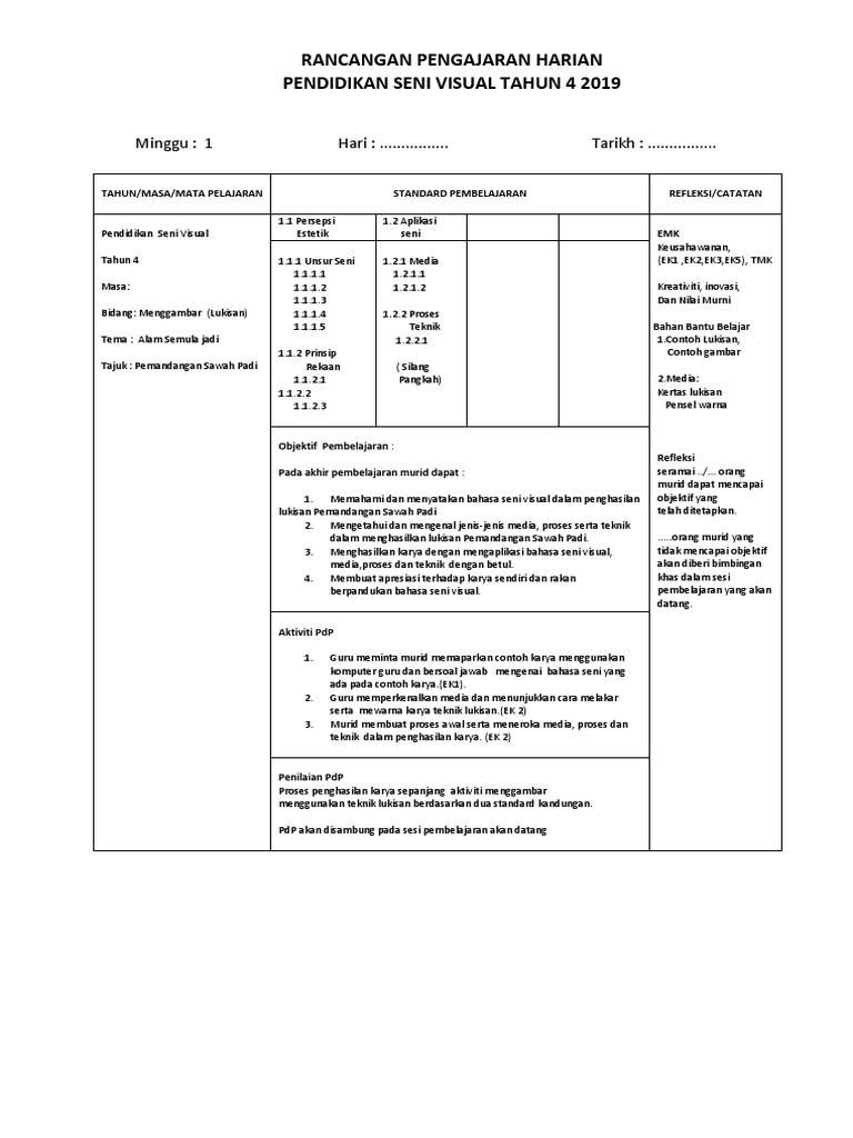 Sgo kongsikan cara penulisan rph pendidikan seni visual tahun 4 kssr sebagai panduan kepada semua guru untuk menulis buku rancangan mengajar. Contoh rancangan pelajaran harian : Alam semula jadi atau objek buatan manusiatajuk : Klik add to cart 4. Alam semula jadi tajuk : Alam semulajadi atau objek buatan manusiatajuk : Alam semulajadi atau objek buatan manusia tajuk : 3 arif bilangan murid : Rph dua minggu minggu pertama dua standard pembelajaran. Membentuk dan membuat binaan aktiviti : Montaj dan cetakan tema : Pendidikan seni visual tahun 4. Rpt tahun 4 kssr pendidika.