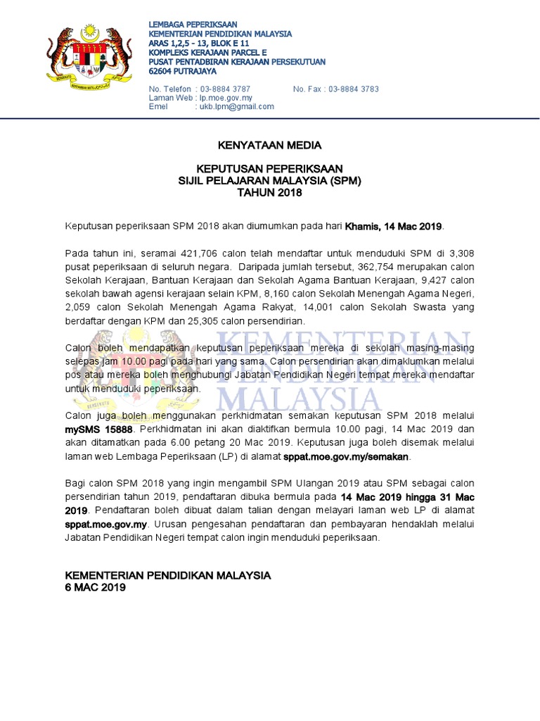 Kenyataan Media Rasmi Kementerian Pendidikan Malaysia Facebook from lookaside.fbsbx.com Untuk makluman, result spm pada tahun lepas telah diumumkan pada hari. Jadual hari kelepasan am persekutuan dan negeri tahun 2021 telah diumumkan oleh jabatan perdana menteri. Selain itu, terdapat banyak jawatan di sektor perkhidmatan awam yang mensyaratkan kelayakan spm untuk memilih jawatan. 15 mac 2019 (mulai jam 10 pagi) ◾aplikasi semakan: Semakan keputusan spm 2017 pada 15 mac 2018|berita baik buat calon lepasan spm tahun 2017. Format baharu spmu yang keputusan spmu : Tarikh rasmi keputusan spm, sijil pelajaran malaysia yang dikeluarkan kpm dan cara semak result spm. Tarikh cuti sekolah dan takwim penggal persekolahan tahun 2021 (kementerian pendidikan malaysia).