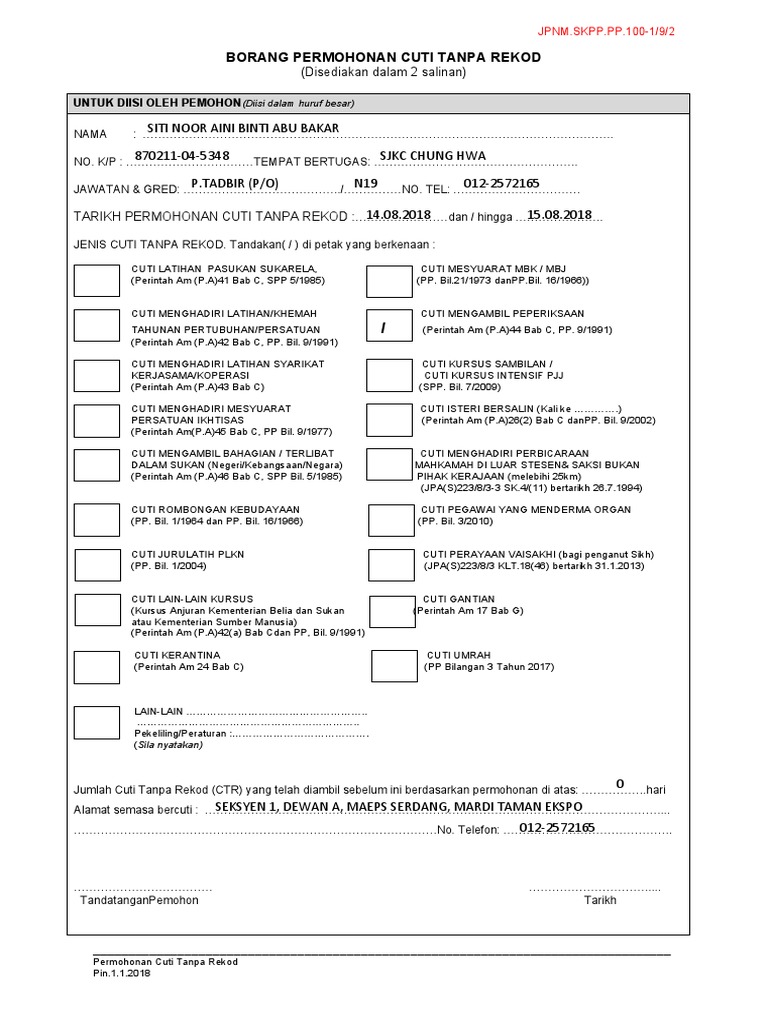 Borang permohonan perjalanan pegawai awam ke luar negara atas urusan permohonan cuti rehat yang telah diluluskan (jika ada). (cara pembayaran akan dihantar ke email). Adakah warga kpm yang dilantik sebagai sukarelawan bagi membantu mangsa banjir layak diberi kemudahan cuti tanpa 3/2017, kemudahan cuti umrah adalah merupakan cuti tanpa rekod untuk pegawai. Surat kpm pelepasan bertugas cuti tanpa rekod semua pemimpin pengakap dan ahli pengakap yang berminat untuk menghadiri kursus kawad istiadat pengakap yang akan diadakan pada tarikh borang permohonan cuti tanpa rekod ctr perintah am bab c cuti tahun 1974 surat pekeliling perkhidmatan bil. Savesave borang cuti umrah versi jpn johor sahaja for later.